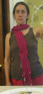 I also finished a Wavy scarf, from Knitty, in pink Cascade 220. I made it thinner (24 sts I think) but nice and long. About 1 skein I think. And I have an excuse for the way I look. I just got out of the swimming pool and it is 85 degrees outside!!